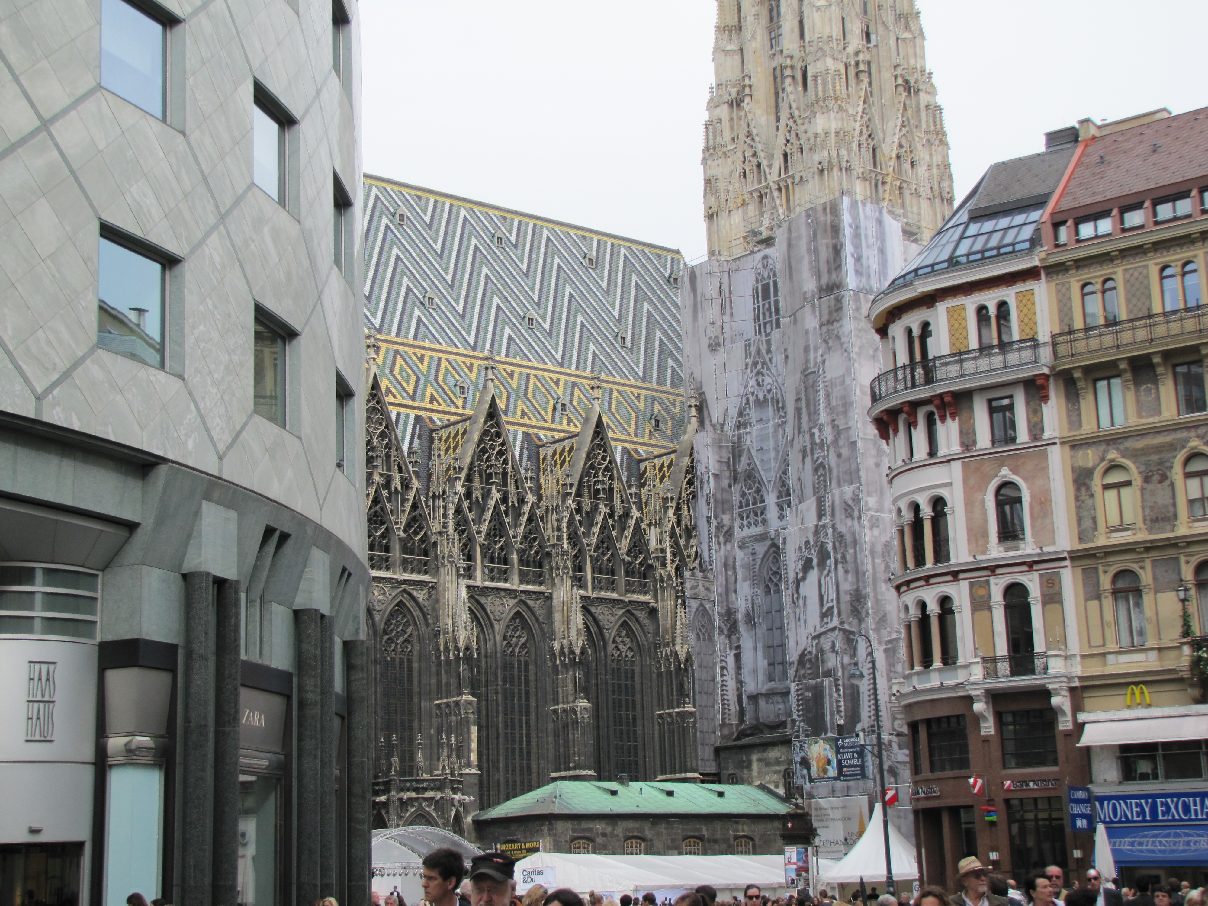The intricate striations and spire of the Stephansdom Cathedral. In the foreground, a McDonalds in the alstadt (“old town”) part of Vienna.