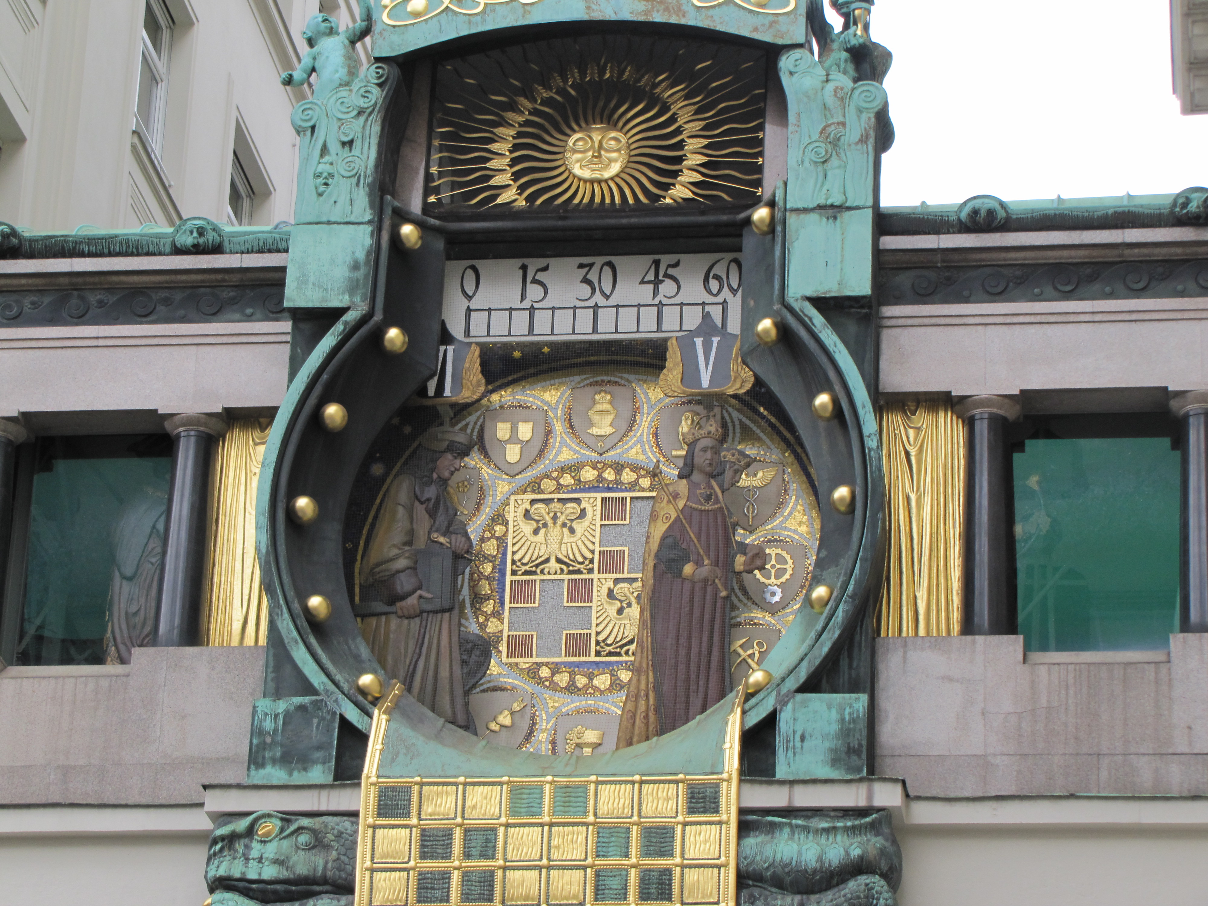 A patinaed Art Nouveau clock (“Ankeruhr”) in the town center. Throngs of people eagerly awaiting the automaton spectacle at noon.