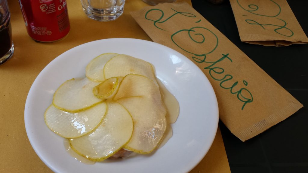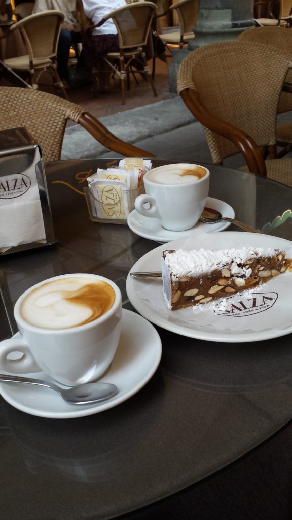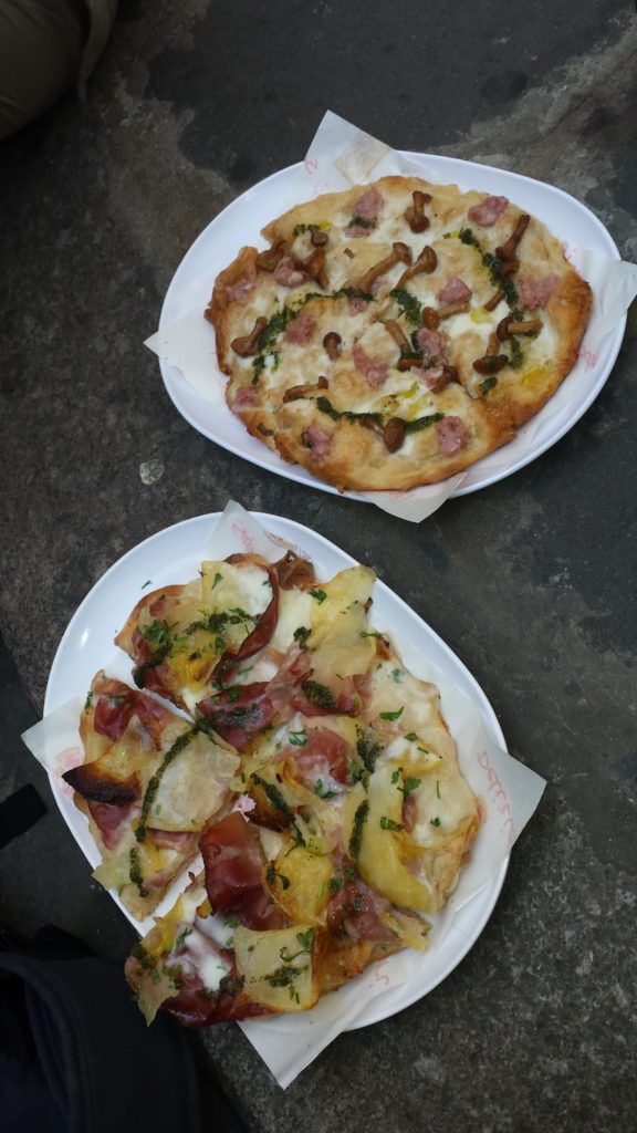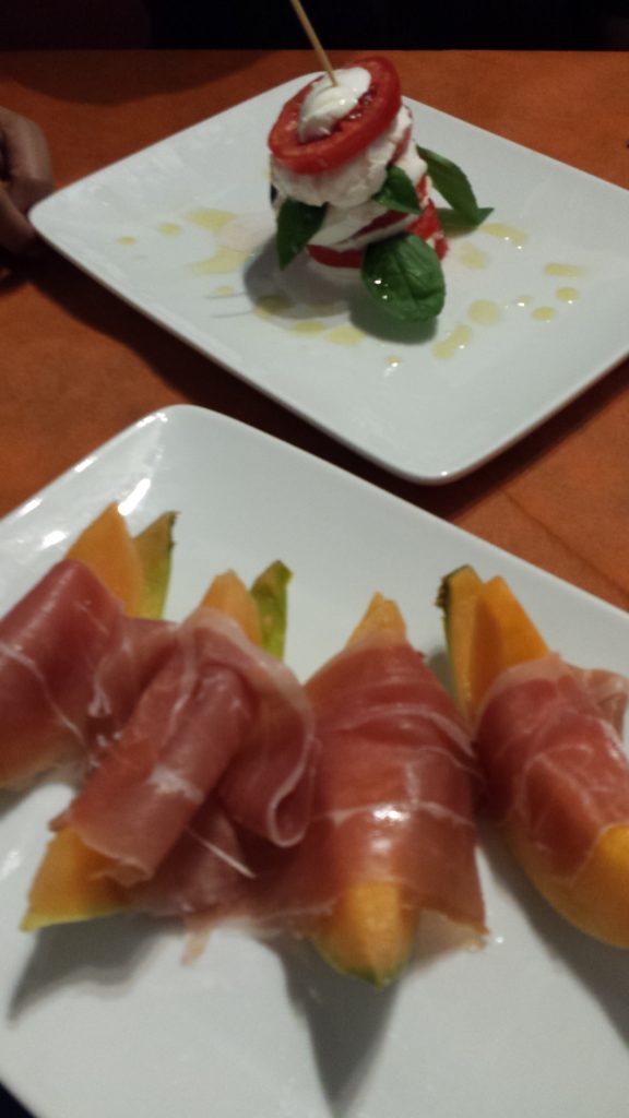 Pizzas from PinserePanforteProscuitto with melon and Caprese SaladRicciarelli cookiesPear and goat cheese BruschettaPici al cinghiale (wild boar pasta), Fagioli bianchi con cipolla (white bean with onion),and Trofie al pesto dell Osteria (twisted pasta with pesto)