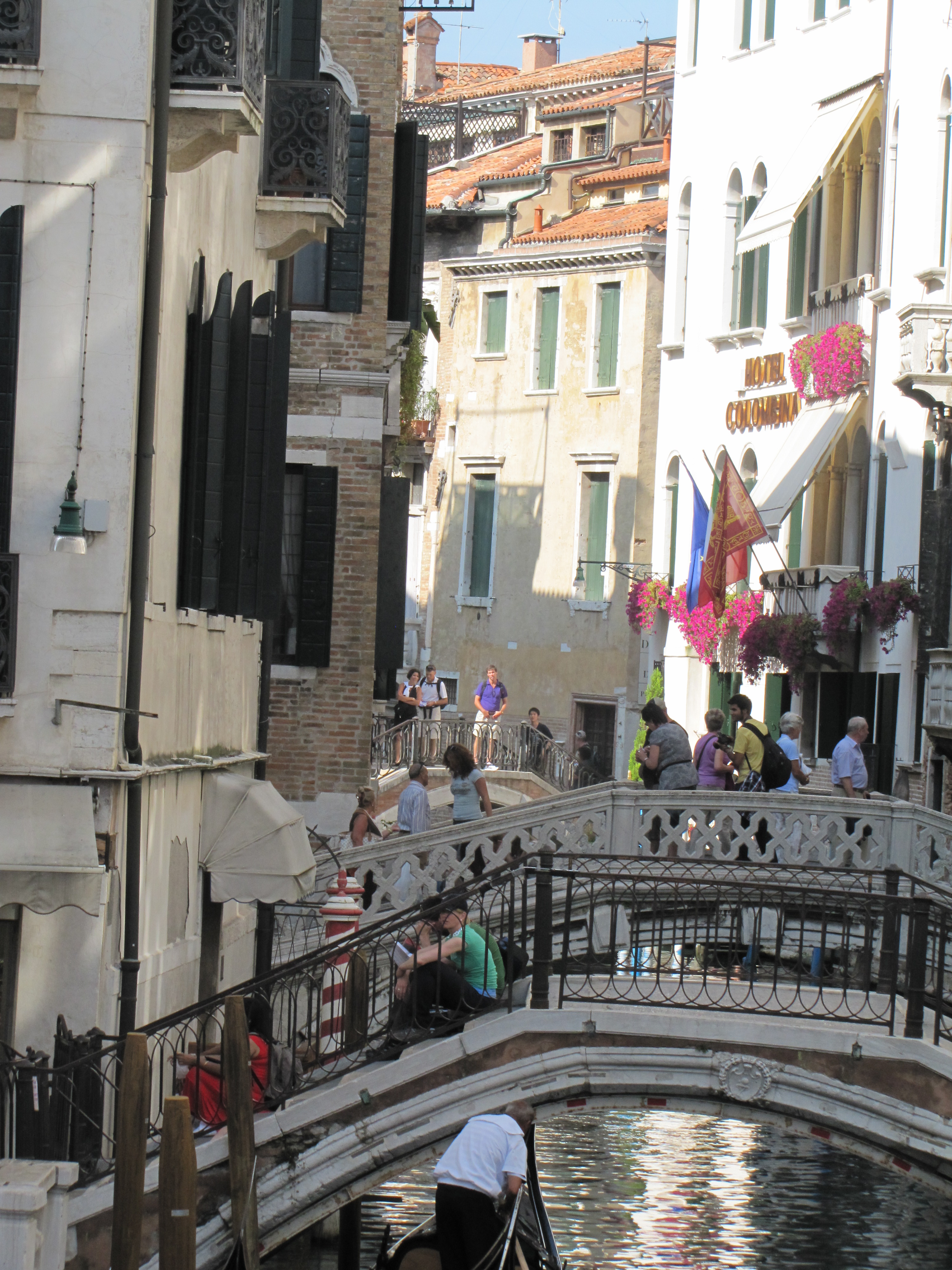 Even in the blistering sun, Venice was filled to the brim with tourists. With so many bodies how did they manage to keep people from falling into the canals? In the distance, just off the horizon, loomed the giant cruise ships waiting for passengers to embark for their next port of call. Lining the major thoroughfares, African refugees (ready at a moment’s notice to scurry away should the Polizia come around) hawked their knock-off Chanel bags and Rolex watches in a number of different languages. A flotilla of colorful umbrellas as tour guides herded their flock of excited guests to the major sights.