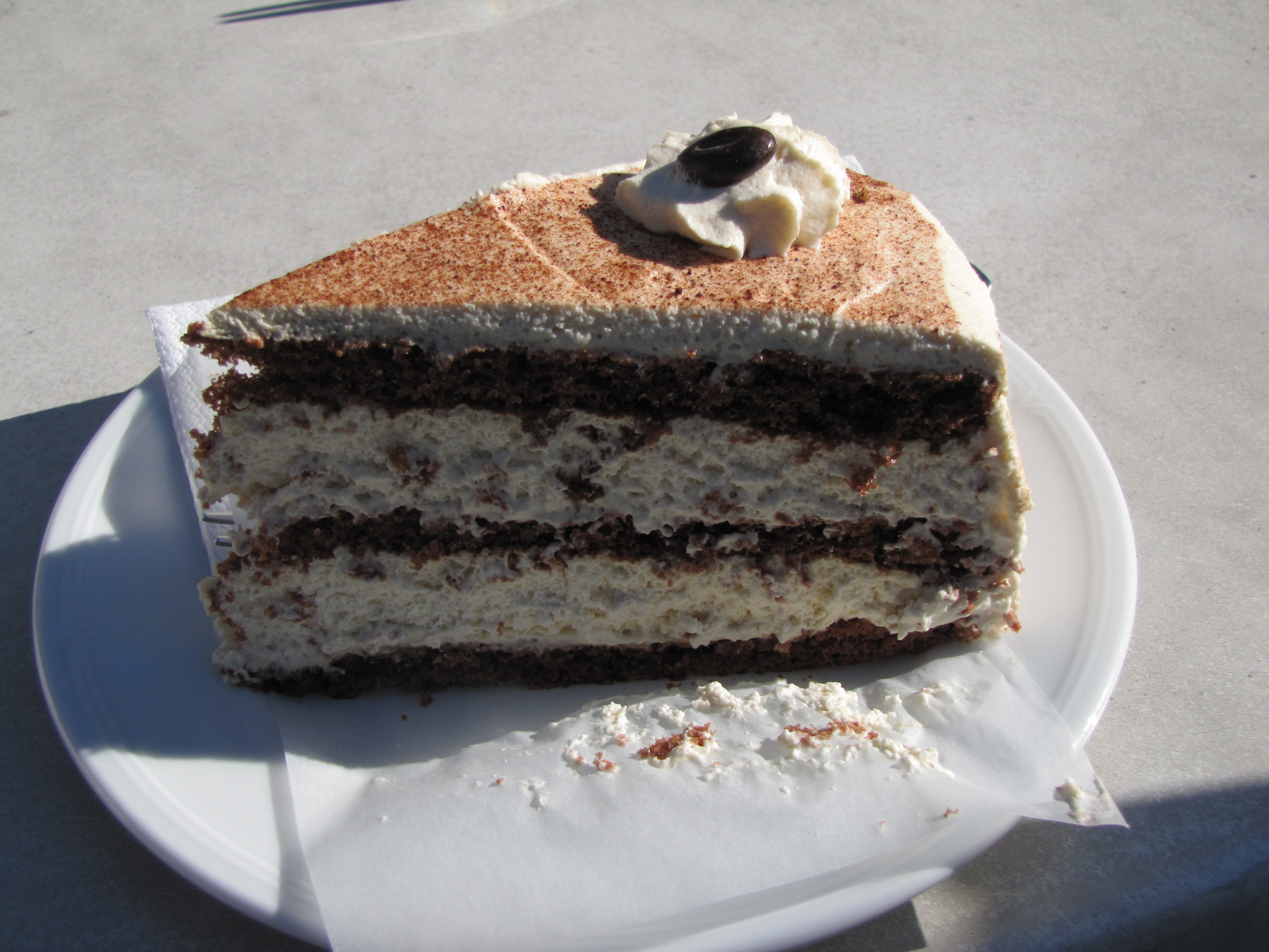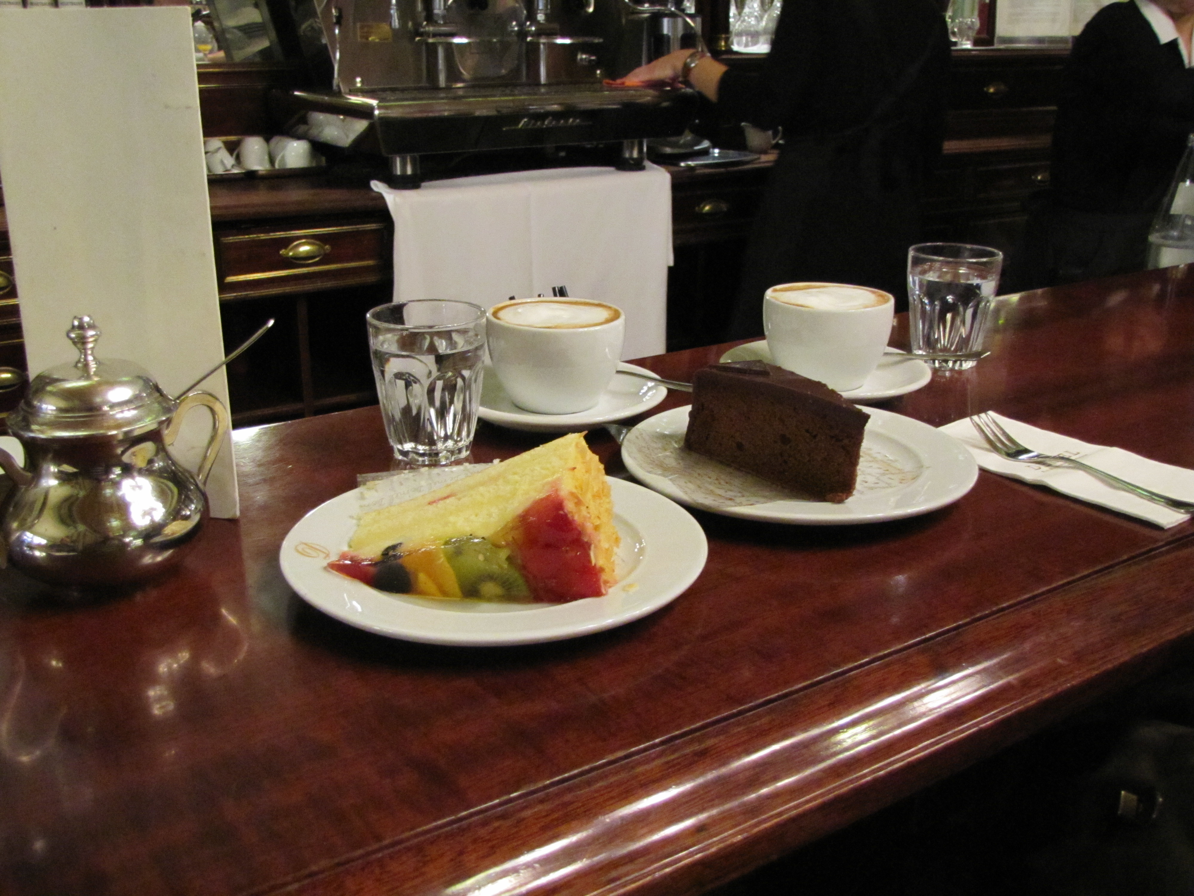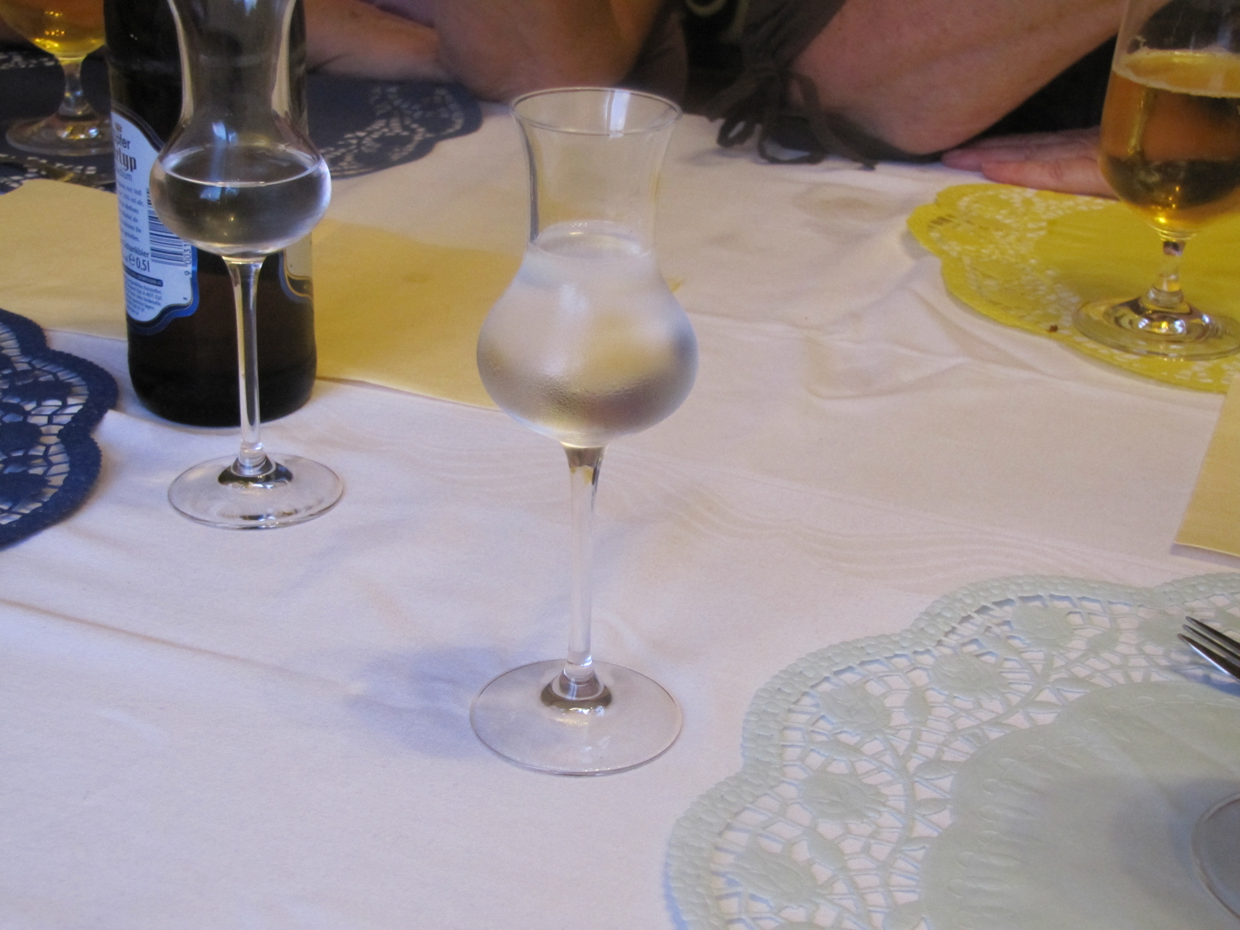 Frittatensuppe, sliced savory pancake served in broth.Backhendl, Austrian fried chicken.Erdapfelsalat, Austrian Potato Salad. No mayonnaise here.Speckknodels, dumplings with bacon (speck).Traditional erdapfelknodels, potato dumplings.Wurstsalat, sausage salad.Austrian beef Goulash.Homemade Apfelstrudel.Fruchttorte (front) and world-famous Sachertorte (rear) at the Hotel Sacher. Cups of Wiener Melange (coffee) to top it all off.Not hundred percent sure what kind of cake it was but we are going to go with Kirschtorte.Mokkatorte? Whatever it is, it was delicious.We are calling this one Apfeltorte because we don’t remember but it tasted like apples.To help with digestion, no meal is complete without an after-dinner schnapps.