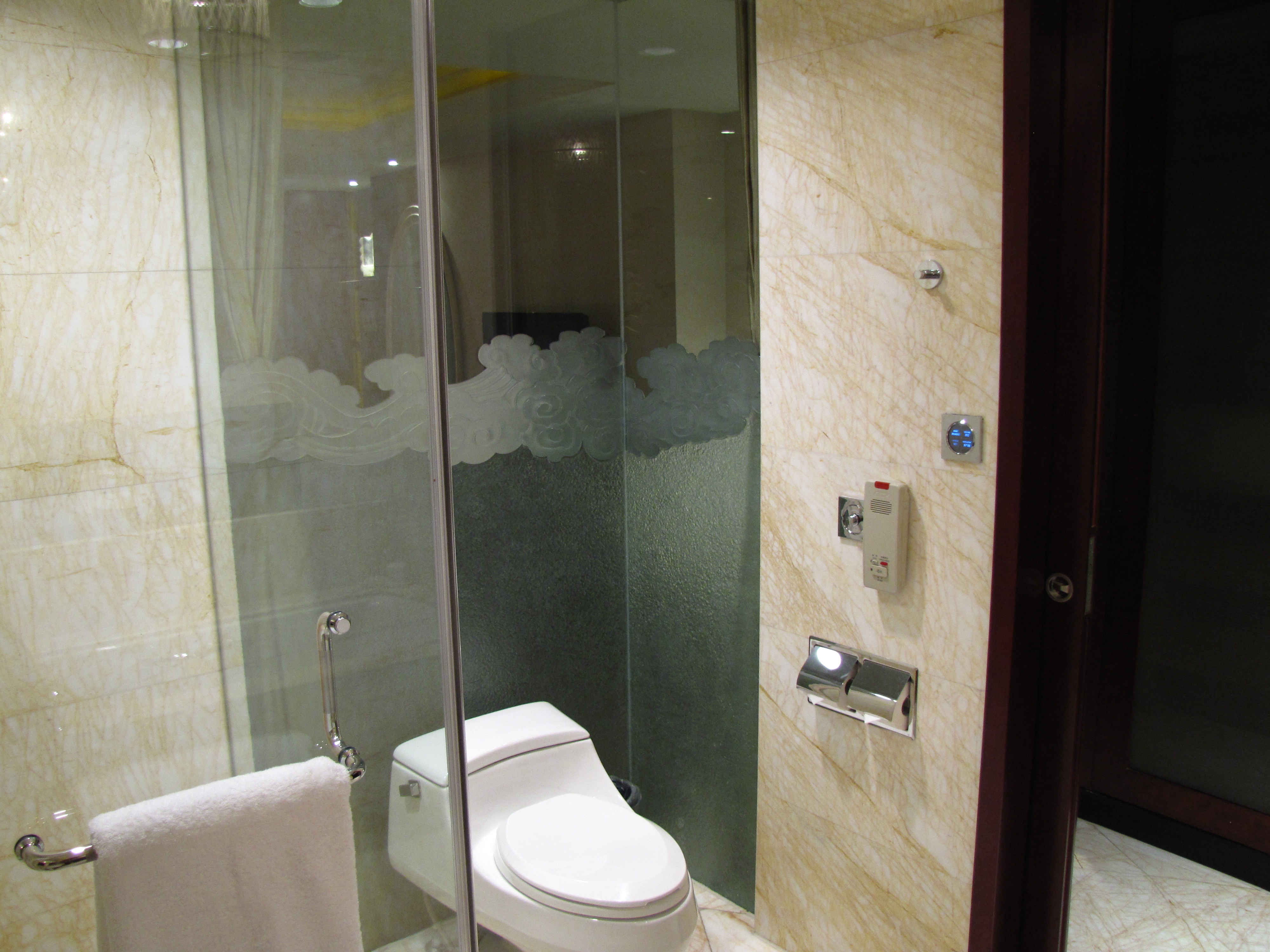 But design elements did not veer only toward the traditional, the contemporary was incorporated in very interesting ways. The toilet in our Beijing hotel room was surrounded by frosted glass in the bottom half, bordered by a Chinese wind/cloud pattern in the middle, and completely transparent up top.
