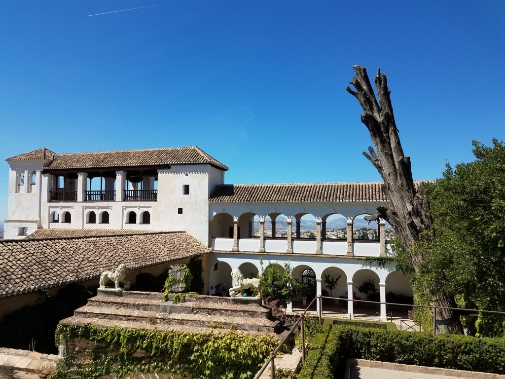 Nowhere do the three concepts better converge than in the peculiarly-named Generalife (jannat al-arif or “Garden of the (holy) Architect” in Arabic). The Generalife is the summer palace/country estate of the Nasrid rulers and overlooks The Alhambra to the south. This is where the emir would escape from the rigors of courtly life. In keeping with the idea of a getaway, the structures are more austere than their ochre-hued counterpart, the vistas more prominent, the layout less cloistered.