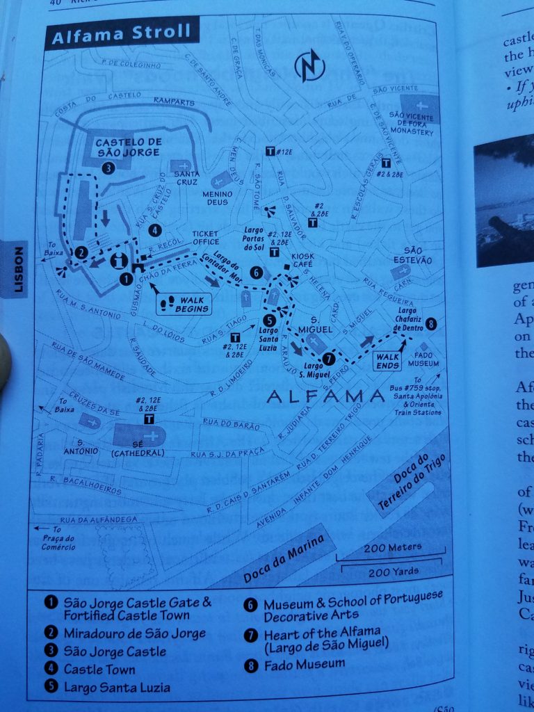 Unlike some other popular capital cities in Europe (Paris and Rome come to mind), Lisbon did not really have that big a draw for us. That explained why rather than doing my usual obsessive-compulsive research on attractions and restaurants, we instead resorted to petty crime. While Bob kept an eye out for store employees, I stood with my back turned in the corner of some bookshelves at our local Half Price Book Store and snapped some covert pictures of walks Rick Steves recommended in his Portugal Guide Book.