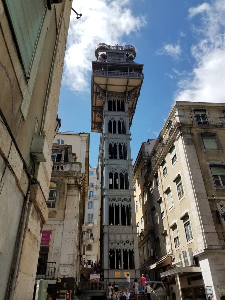 We should have marveled at the Elevador de Santa Justa that connects the lower Baixa district of Lisbon to the higher-elevated Bairro Alto neighborhood, but we didn’t. The Gustave Eiffelesque exterior and wood-paneled interior were not enough to convince us to wait in line for an hour only to be crammed with 23 other sweaty people to go up 7 stories.